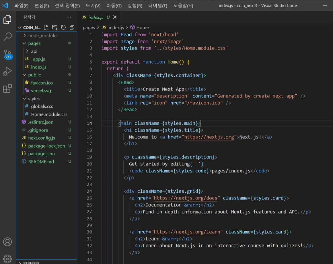 보면 이거는 next 개발사 웹사이트에서 코드를 그대로 가져온 기본 세팅 상태인데