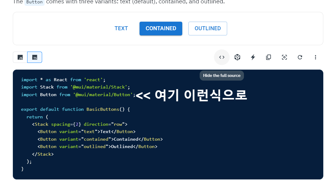 3. 원하는 버튼 형태에서 <> 아이콘을 누르면 import 코드를 복사해서 사용할 수 있다.