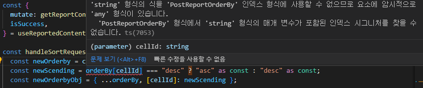 매개변수 타입 (string) = 키 인덱싱 타입 (string) 일치 시켜줬더니 에러 해결!