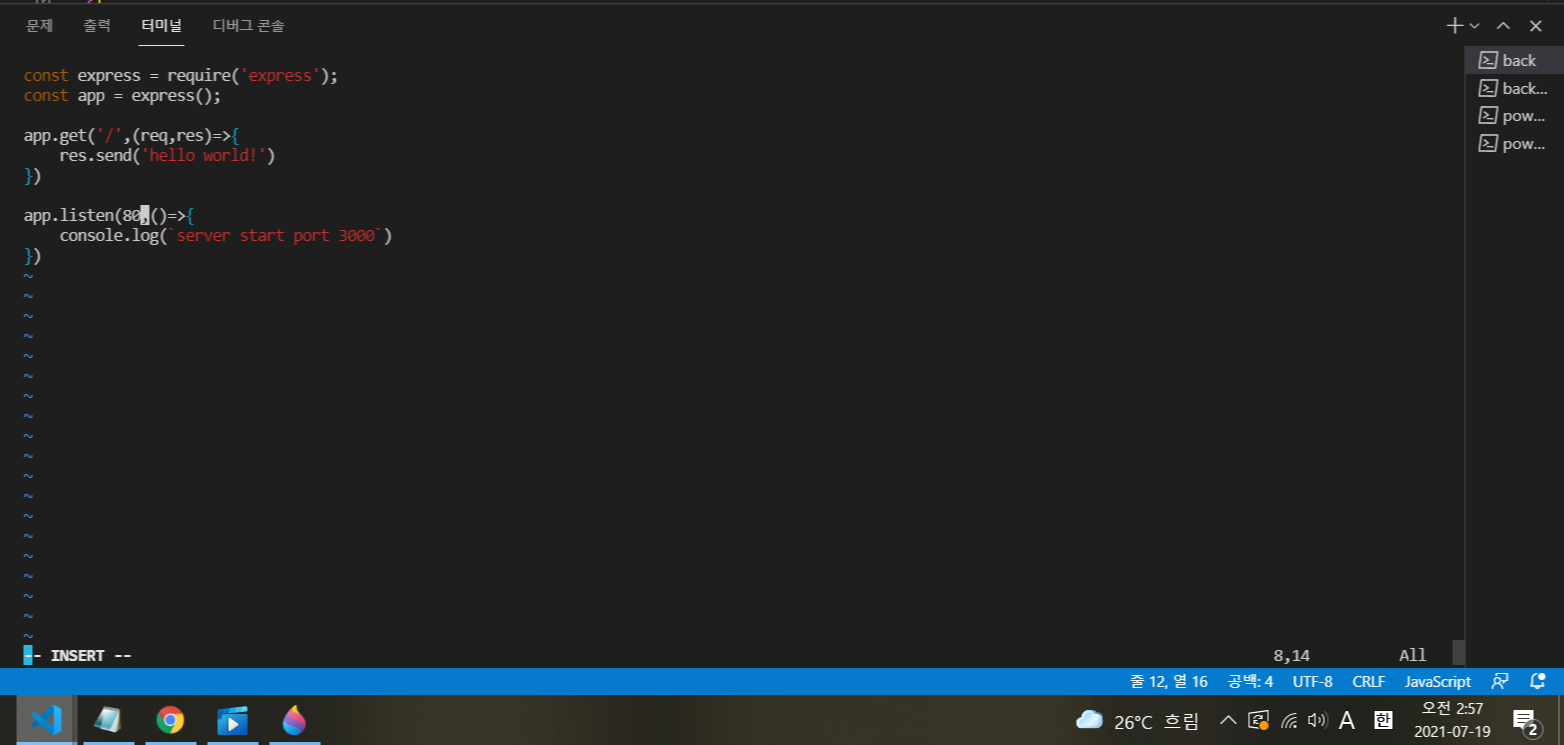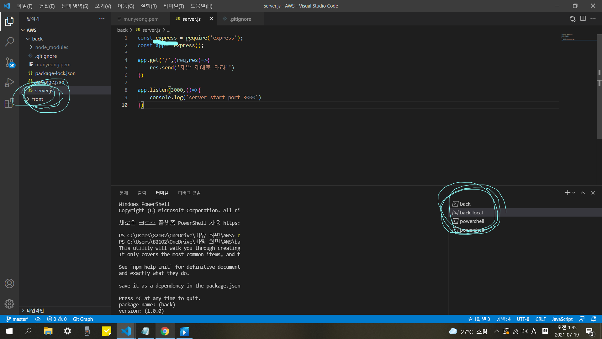 express 서버를 돌릴 터미널은 따로 back-local이라는 이름으로 만들어 놓는다!